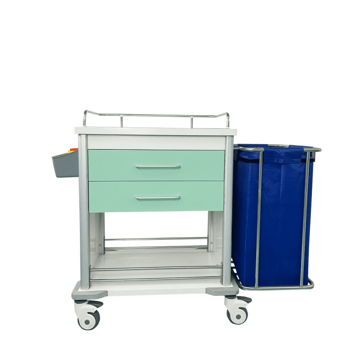 It is used in nursing department. Main body is made of high quality aluminum and steel welded, with light body, mobile flexible; Work surface is made of high strength steel welded forming, abrasion resistance, corrosion resistance, permeability, easy to clean; Fence made of stainless steel pipe. Configuration of two drawers, internal activity type medicine case; Main body on the right side is equipped with care bag, made of high quality fabric, removable, convenient and clean; The left side is equipped with ABS hanging basket; Phi 100 silent castor 4 (two of them with brake), mute the winding, introduce flexible capacity is big, and equipped with collision Angle.