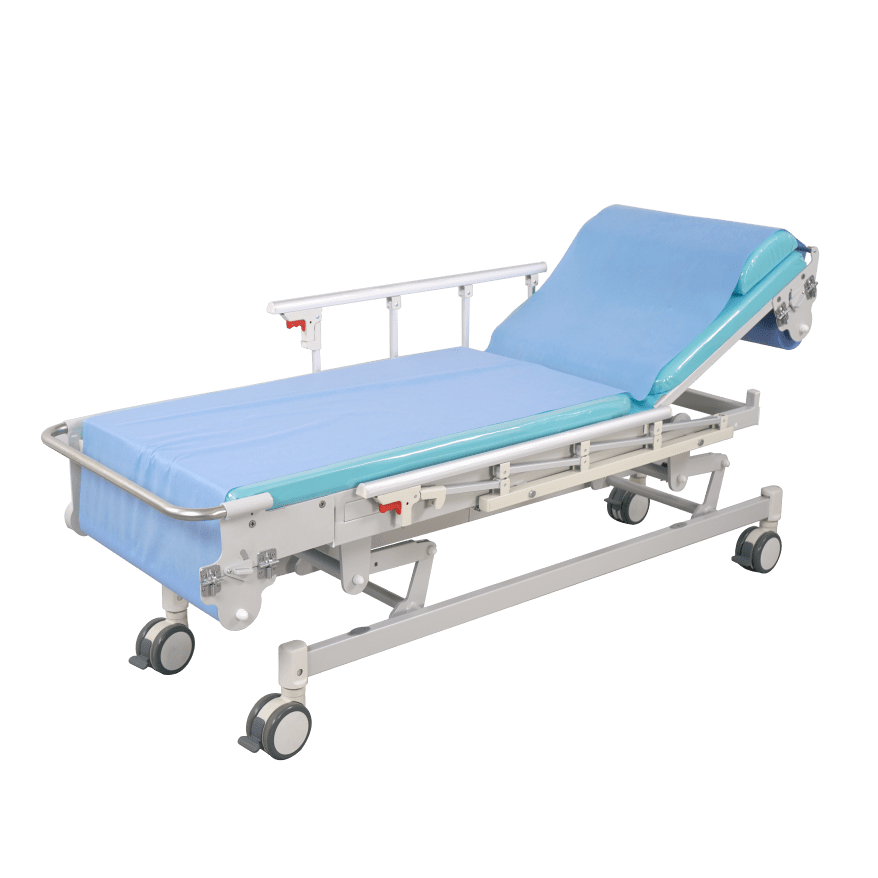 HIGHTLIGHT 125mm dual-brake medical casters (center-lock optional). Hand controller: Bed elevation, backrest lift, one-touch bed-flattening, instant CPR position. Stainless steel end-frame handle: Facilitates bed transport. 4-stage aluminum alloy guardrails (optional). Motorized Drape Auto-Advance. PARAMETER: Bed size 2070mm*720mm*550mm~900mm Lifting height 350mm Mattress size 1900mm*650mm Paper roll width 600mm Back lift 75° PRODUCTManual control operation can control: bed body lifting, back lifting, one-button change sheets, one-button CPR and other functions. The end of the bed body is equipped with stainless steel pusher to facilitate the moving of the bed body. Optional aluminum alloy four-speed guardrail bed body lifting process to ensure patient safety