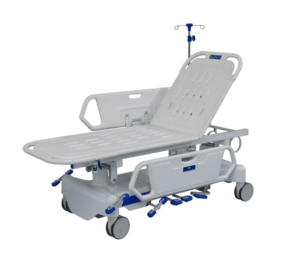 This medical cart uses high-quality carbon steel spray frame, strong and beautiful; Guardrail, bed plate and side guard plate are PP blow molding, lightweight and durable. Equipped with damper controlled flat surface, silent rubber wheel, hydraulic lifting system and central control brake system, easy and stable operation. The mattress is waterproof and anti-static, and there are infusion rack holes around it to meet various medical needs. The overall design combines functionality and safety, making it ideal for medical environments.